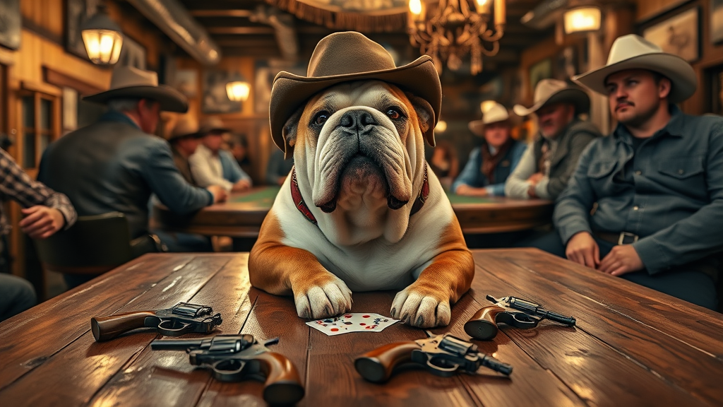 A highly detailed portrait of an English bulldog seated at a wooden poker table in a bustling classic western saloon, surrounded by cowboys in faded denim and leather vests. The bulldog sports a miniature cowboy hat tipped slightly to the side and has a confident, jovial expression. Its paw rests on a hand of poker cards, with vintage revolvers casually lying on the table. The scene is warmly lit by the soft glow of flickering lanterns, casting shadows across the rough-hewn wooden floors and walls adorned with sepia-toned photographs of the Old West. Captured in RAW photo format, the image is in 8k ultra-high definition with the high-quality detail typical of a Fujifilm XT3 DSLR camera, showcasing the textures of the bulldog's fur, the grain of the wood, and the patina on the revolvers, while the soft clink of poker chips adds to the lively atmosphere.