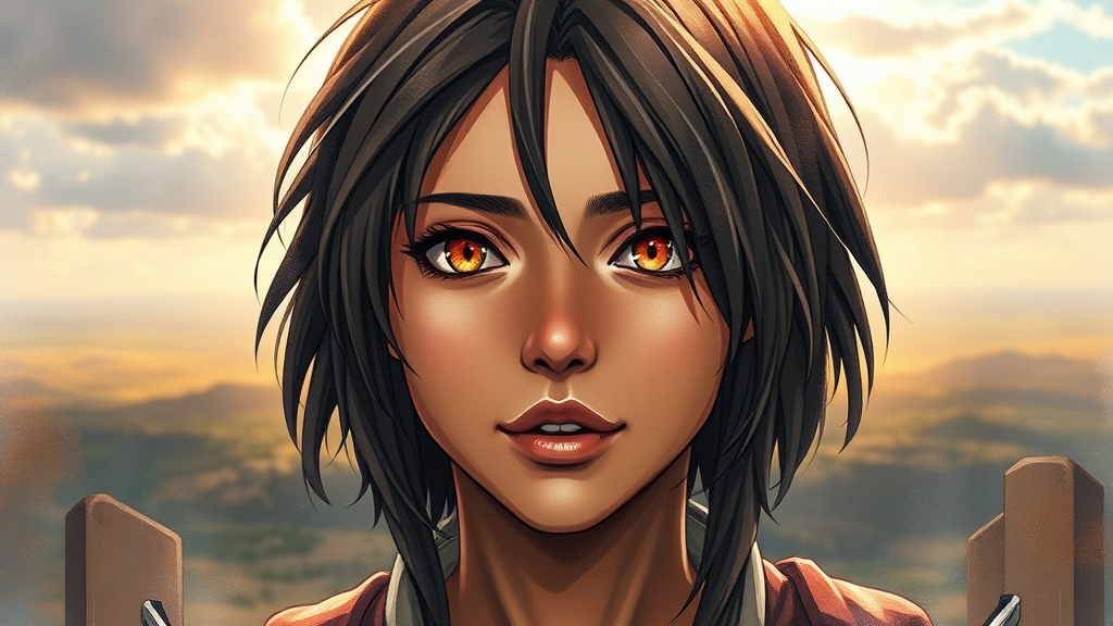 A highly detailed portrait of "Eren Jaeger from Attack on Titan," cinematic, dynamic, and capturing the essence of entrapment and connection, with a focus on the horizon. This digital illustration showcases perfect anatomy, centered and approaching perfection, in vibrant watercolor painting style. Inspired by artstation concept art, the image blends influences of 16k HDR with diverse elements, such as a black woman with Asian features, red eyes, and brown hair, portraying a sense of unity and diversity. The illustration creatively reimagines Eren with an elongated neck and unique hairstyle, highlighting a blend of African and Asian influences. Despite being vibrant, elements of monochrome and black-and-white tones add depth and intrigue. The composition maintains a high quality without deformations, presenting a flawlessly drawn face with striking eyes, avoiding any unintentional mutations or disfigurements, creating a unique and memorable depiction.