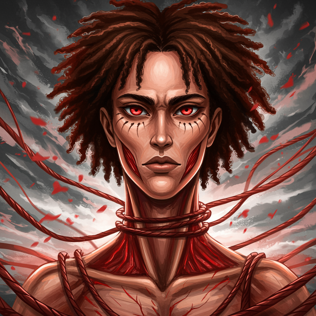 A highly detailed portrait of "Eren Jaeger from Attack on Titan" with a cinematic flair, capturing the themes of entrapment and connection as he appears to be bound and tied against a vast horizon. The digital illustration showcases perfect anatomy and is centered to create a sense of approaching perfection. The scene is dynamic and highly detailed, with vibrant watercolor textures that hint at concept art seen on art platforms like ArtStation. The portrait is rendered in a way reminiscent of 16k HDR, blending elements reminiscent of a Chinese woman and a black woman, with an emphasis on monochrome and black-and-white contrasts. The image avoids low quality, cartoonish features, ensuring a non-realistic representation that incorporates Asian and Chinese influences. Eren's eyes are depicted in a striking red, complemented by his brown, African-textured hair and elongated neck. The art avoids plasticity, deformation, blur, or bad anatomy. The expression is focused, avoiding crossed eyes, disfigured features, poorly drawn aspects, mutation, or mutation-like traits, maintaining the character's essence while exploring creative modifications.
