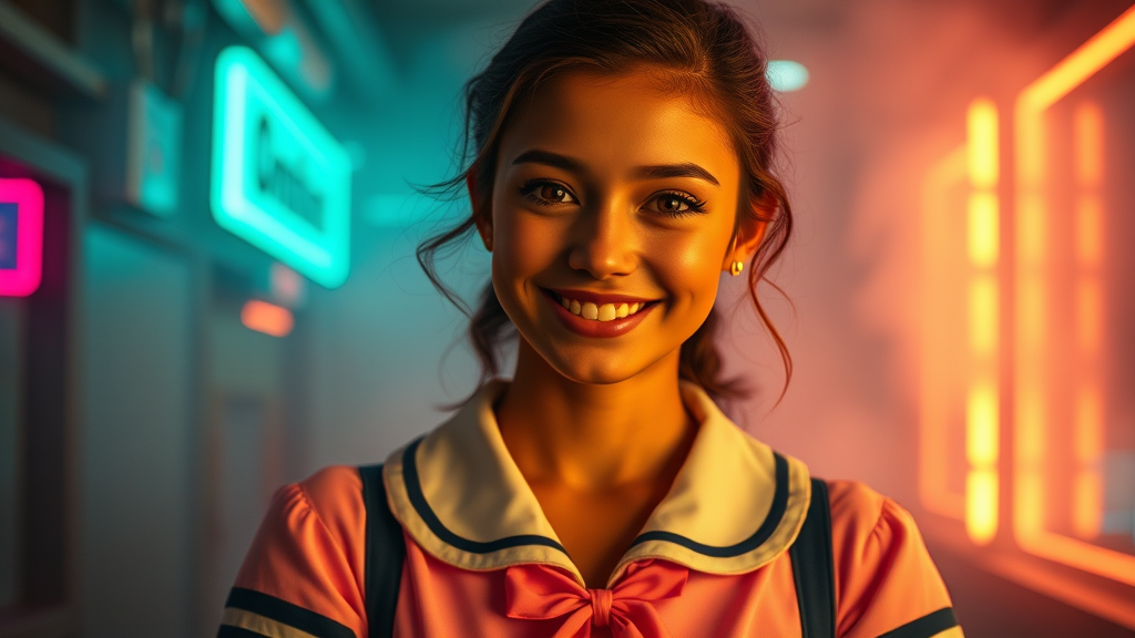 A highly detailed professional photograph of Anya Taylor-Joy in a vibrant preppy schoolgirl uniform, her olive skin glowing, with a captivating smile on her flawless face. The backdrop features a mesmerizing blend of neon lights and smoke, creating an ethereal atmosphere with volumetric fog. The indirect lighting enhances the hyperrealism of the scene, capturing every intricate detail in breathtaking 8k UHD resolution, with a touch of magical realism for an otherworldly allure.