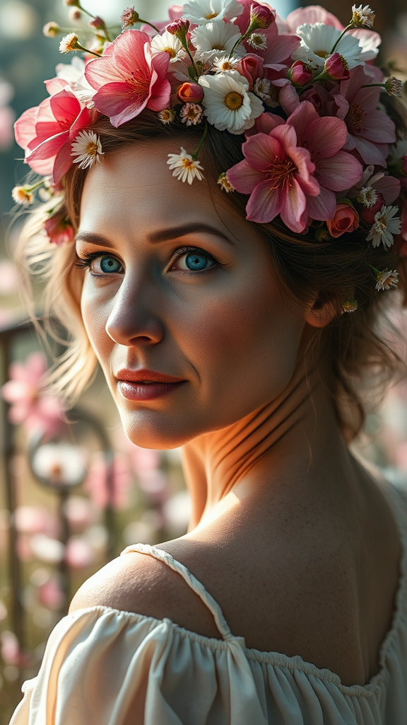 A highly detailed RAW photo portrait of a 50-year-old large-boned woman adorned with flowers in her hair, set against an ethereal garden backdrop. Inspired by the style of Anna Dittmann and featured on CGSociety, this piece of fantasy art is crafted from a multitude of delicate blossoms. The photo, captured from a hip-level angle using a Cinestill Hasselblad with a 50mm tilt-shift lens, exudes soft, photorealistic lighting. It is a masterpiece of ultra-realism, capturing intricate details with high-definition clarity in 8k quality and harmonious golden ratio composition. Her skin is depicted with high detail, matte texture, and visible pores, enhanced by soft lighting and subsurface scattering. The image is a testament to realistic studio photography with a focus on natural shadows. It avoids any artistic flaws, ensuring a picture-perfect representation without elements like low resolution, artifacts, or unnatural features. The portrait is a sublime blend of realism and fantasy, maintaining an exceptional standard of visual quality.