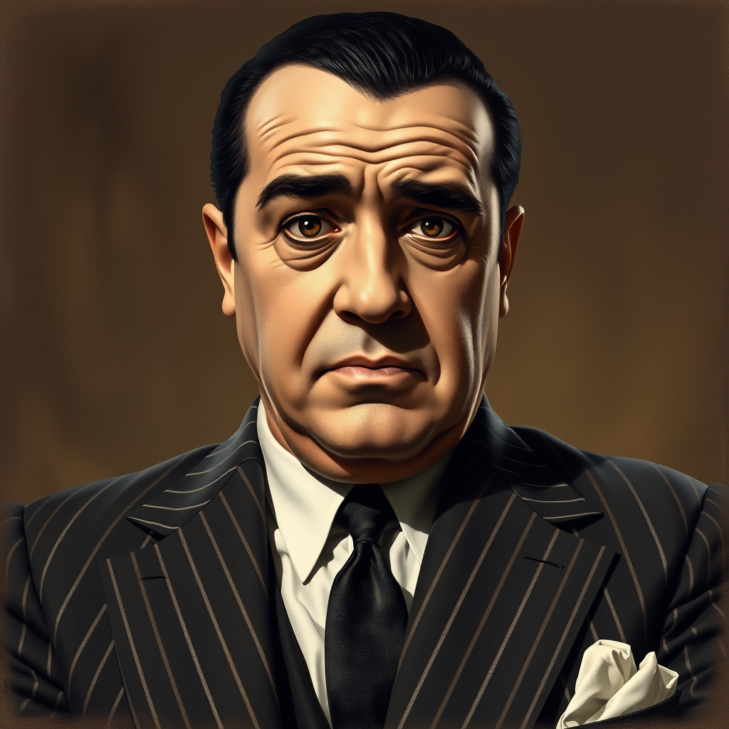 A highly detailed, realistic portrait of Al Capone in his iconic pinstripe suit, rendered in vintage sepia tones, digital painting inspired by the styles of Greg Rutkowski, Alphonse Mucha, and Norman Rockwell, evoking a sense of early 20th-century charm and intrigue, capturing his enigmatic expression, focusing on fine details like textures, shadows, and the glint of determination in his eyes, set against a classic background that enhances the nostalgic atmosphere, evoking a timeless gangster allure.