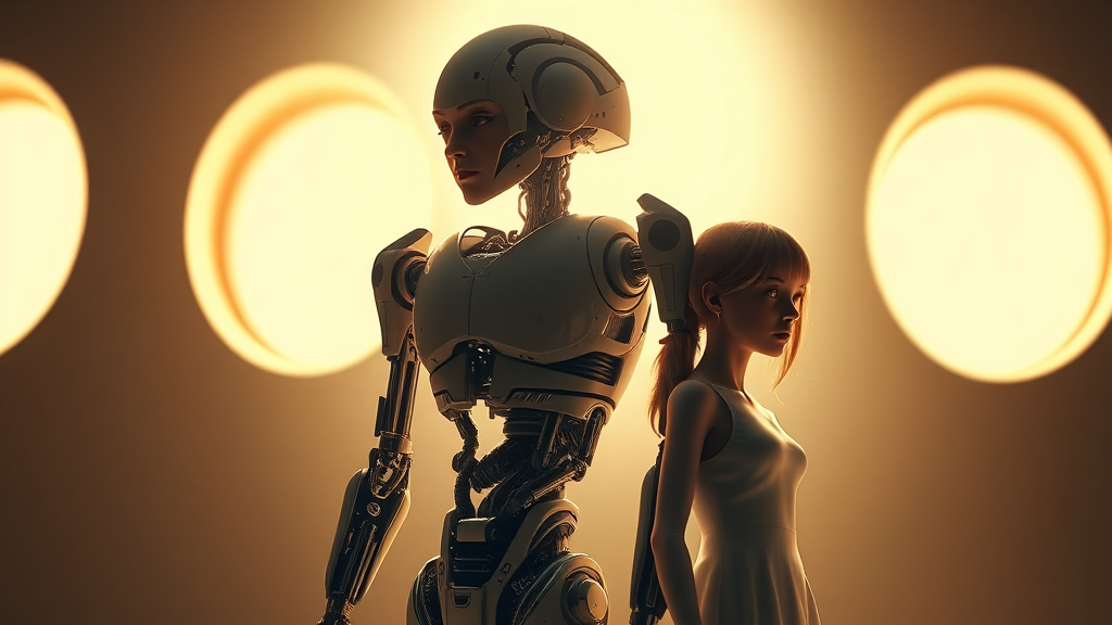 A highly detailed realistic robot in the style of the Chappie film stands next to a minimalist girl figure. The scene is illuminated by blinding light, highlighting a folded torso and dual-headed design. The composition appears as a totem with two interconnected figures, but it features distorted anatomy and extra limbs that create a surreal effect. The faces and bodies of the figures have elements of mutation, presenting a deformed, blurry appearance. Imperfections are visible, with blurred, dehydrated features and inconsistent proportions. Medley lines resemble jpeg artifacts, while cloned and mutated elements give the figures an otherworldly look. The scene contains odd anatomical details like severed and floating limbs, double faces, and distorted hands. The setting is saturated and contains hints of round windows and circles. The characters exhibit lifeless expressions, symbolizing a complex mixture of robotic and human traits.