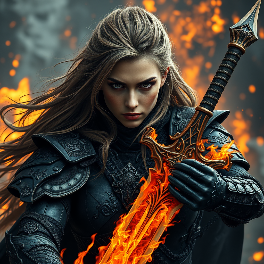 A highly detailed realistic woman clad in ominous black armor, her long hair cascading around a perfectly rendered human face. She wields a fiery sword that glows with intensity, her armor embellished with intricate dragon motifs. Her expression is focused and intense, showcasing depth and emotion. The scene captures her in an epic pose amidst a backdrop of fire and ash, evoking a sense of horror and power. The entire composition is rendered with sharp focus and fine details, creating an awe-inspiring atmosphere. The character is portrayed in full body with a super detailed and realistic face, set against a resonant and dramatic high-resolution 32k background.
