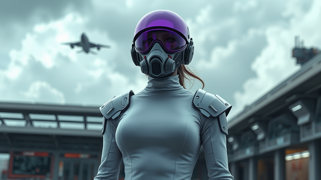 A highly detailed rendering of a female figure in a sleek white form-fitting jumpsuit standing in a bustling spaceport. In the background, a spacecraft takes off into the cloudy sky, casting a dramatic overcast ambiance. The woman wears a futuristic purple visor mask, complete with advanced sci-fi lens and respirator, surrounded by segmented plate armor on her shoulders and chest that appears both protective and stylish. Her attire is adorned with isolated metallic armor pieces, providing a stark contrast to the softness of her jumpsuit. This scene is captured from a third-person perspective at a low angle, emphasizing her stature. The environment is portrayed with meticulous attention to fine detail, evoking the style of a sci-fi blockbuster. The image features natural textures and lighting, with strategic cinematic lighting applying mood and depth. Ray tracing technology enhances the photorealism, creating an 8K Ultra-HD cinematic experience with moody lighting. The overall presentation is a seamless blend of CGI techniques, using Octane rendering for a ultra-realistic touch, though avoiding any errors like extra limbs or disfigurations, ensuring anatomical accuracy and coherence.