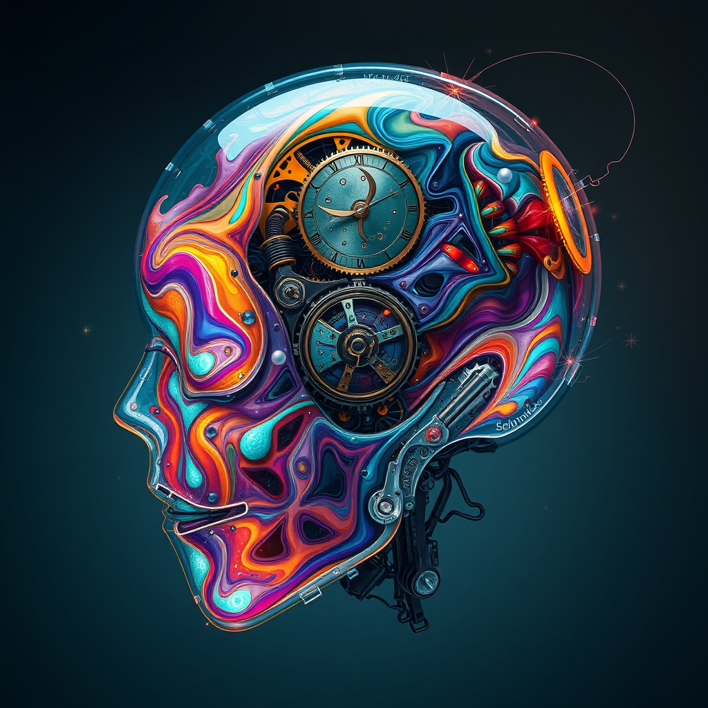 A highly detailed robot head with intricate clockwork mechanisms, featuring a transparent exterior filled with swirling, vibrant liquids of various colors, showcasing an expressive and abstract design. The piece is inspired by the futuristic and imaginative style of Ryohei Hase and is trending on ArtStation, incorporating subtle bioluminescent elements and delicate, ethereal patterns that suggest a fusion of technology and art.