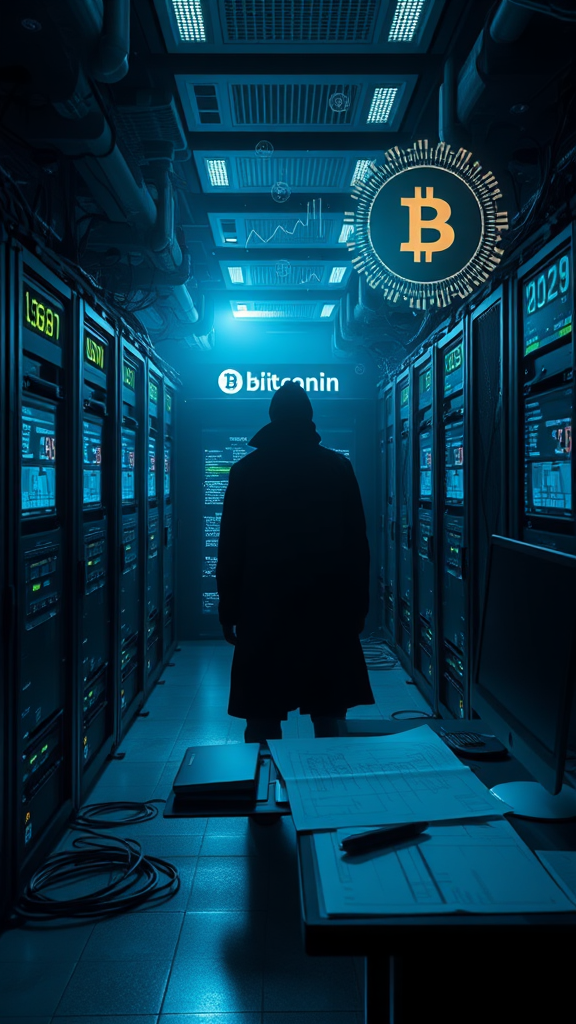 A highly detailed scene of a mysterious figure, resembling Satoshi Nakamoto, standing in an advanced bitcoin mining lab filled with rows of high-tech servers and blinking monitors. The air is filled with a faint hum of machinery as cool, ambient light spills across the room. The figure, shrouded in shadow, is examining a digital display showing fluctuating bitcoin values and mining statistics. Blueprints and technical drawings are scattered across a nearby desk, while holographic projections float mid-air, offering a glimpse into futuristic cryptocurrency algorithms. This photorealistic depiction captures the enigmatic nature and innovative spirit of cryptocurrency mining.