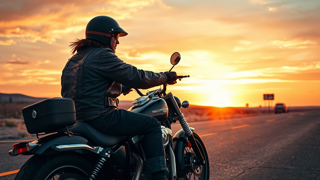 A highly detailed scene of a rugged biker on a Harley Davidson motorcycle riding along the iconic Route 66, captured from a side view during a breathtaking sunset. The sky is ablaze with warm hues of orange and pink, casting a golden glow on the open road. The biker, wearing classic leather gear and a vintage helmet, exudes a sense of freedom and adventure as they cruise through the vast, open landscape. The rumble of the engine and the setting sun create a moment of serene intensity, embodying the spirit of the open road.