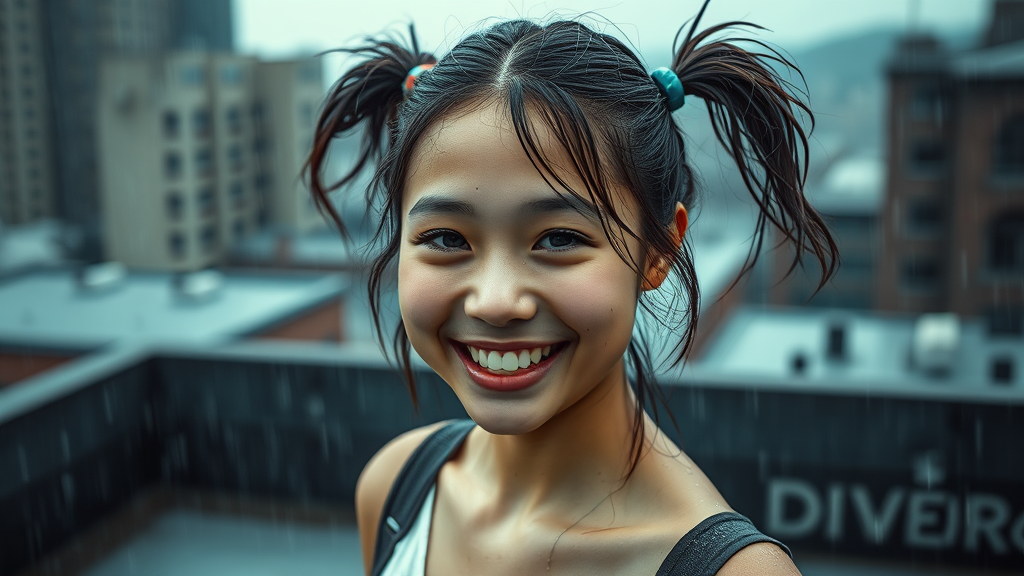 A highly detailed scene of a young woman standing on a rooftop in the rain. She has wet hair, styled in ponytails, and a bright, cheerful smile. The rain glistens on her skin and clothes, creating a vibrant, dynamic atmosphere. Her face is expressive, full of life and joy despite the downpour. The setting is a moody cityscape, with rain-soaked buildings in the background. The image captures the essence of spontaneity and freedom, highlighting her carefree nature. The focus remains solely on her, ensuring clarity and beauty without distortions or unnatural edits.