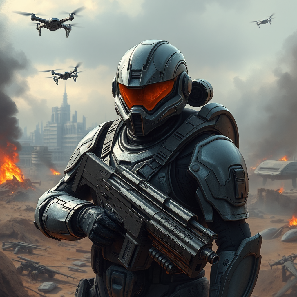 A highly detailed sci-fi futuristic soldier, clad in advanced armor with intricate design elements, wielding high-tech weaponry. The sleek, reflective visor of the soldier glimmers under dynamic lighting, highlighting the complexity of the scene. They stand resolute against a war-torn battlefield backdrop, where hovering drones patrol above the smoldering wreckage of past battles. In the distance, the skyline of a futuristic city looms under a smoky, foreboding sky. Despite the chaos, the digital painting captures a moment of tense calm, emphasizing the soldier's readiness and the high stakes of their environment.