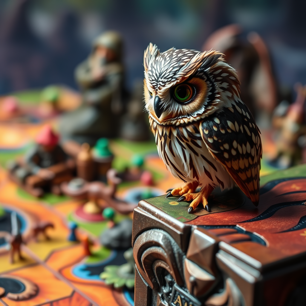A highly detailed, sharp-focused scene featuring a miniature owl perched on the edge of a Dungeons & Dragons game board, its intricate feathers and wise eyes observing the colorful, miniature fantasy landscape and characters unfolding in a 3:4 aspect ratio.