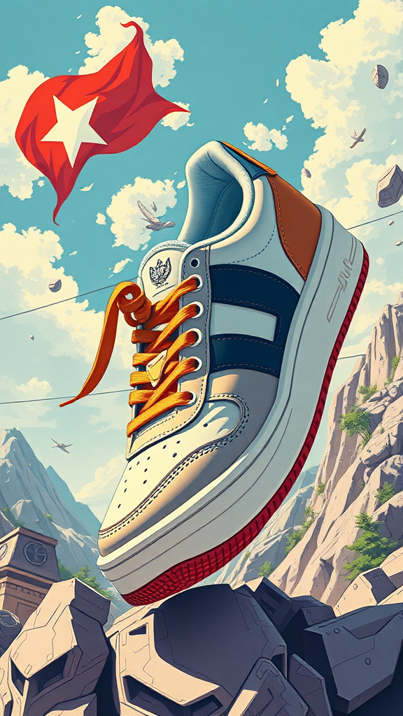 A highly detailed sneaker design inspired by a Soviet-style poster, blending elements of USSR propaganda art with anime influences, rendered in offset printing quality. The poster features a dynamic composition with vibrant colors in CMYK, highlighting the shoe in an imaginative and heroic manner. The scene is imbued with an upbeat and cheerful atmosphere, utilizing natural lighting to emphasize the intricate details. The aspect ratio is 2:3, capturing the essence of a classic propaganda piece with a modern twist, celebrating innovation and style in footwear design.