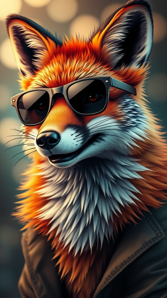A highly detailed stylized three quarters portrait of an anthropomorphic rugged happy fox wearing sleek sunglasses, with a textured fur pattern that adds depth and character to its face; the fox's expression exudes charm and confidence. The background features a soft blur with bokeh lights, enhancing the vibrant colors and giving a sense of subtle movement. Lighting gently highlights the fox's features, casting dynamic shadows for added realism, with the overall artwork maintaining a rich and lively palette.