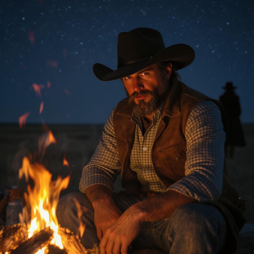 A highly detailed three-quarter close-up portrait of a 28-year-old cowboy sitting by a campfire on the open prairie, embodying the essence of the western genre. The scene captures breathtaking beauty and is a key visual element with comprehensive cinematic quality and ultra-sharp focus. The cowboy, with a rugged yet captivating appearance, gazes into the fire, his hat casting a shadow over his weathered face. In the background, the prairie stretches into the horizon under a starlit sky. His attire, simple yet iconic, enhances the authenticity of the setting. Nearby, a glimpse of a borderlands woman adds intrigue, her presence subtly suggested rather than detailed, preserving the focus on the cowboy. The atmosphere is free of digital artifacts, retaining clarity and purity, emphasizing natural beauty without distractions or imperfections. The scene speaks to the timeless allure of the frontier, merging tradition with a touch of modern storytelling.