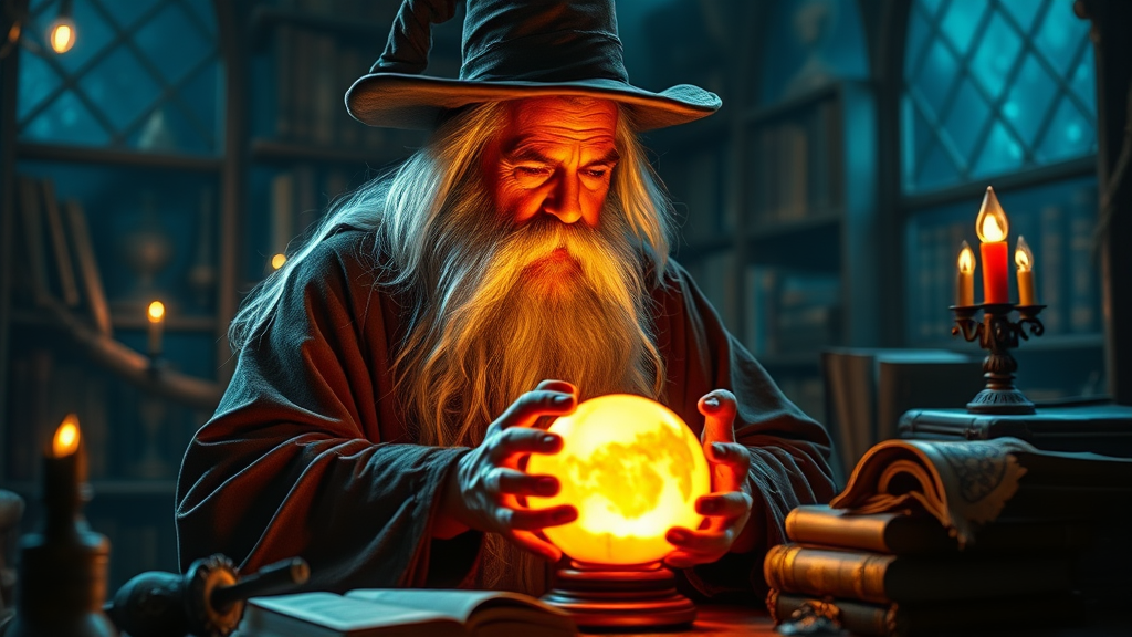 A highly detailed, UHD depiction of an old wizard with a long white beard and hair, dressed in traditional wizard robes and hat, deep in thought over a glowing orb in his dimly lit chamber. The room is filled with the ambient glow of magical light, creating a cinematic atmosphere with sharp focus on intricate details. The setting reflects the mystical ambiance of a magician's study, with flickering lights casting shadows across ancient books and peculiar artifacts. The image maintains a high quality, ensuring all elements are sharp and clear with no artifacts or distortions, capturing the essence of a magical moment.