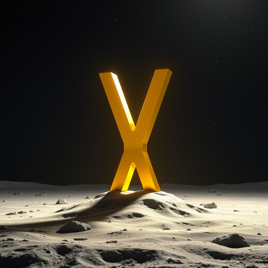 A highly detailed, ultra-realistic 3D render of a bright golden letter V standing majestically on the lunar surface, illuminated by cinematic lighting with the vastness of space as a striking backdrop, cosmic stars twinkling softly in the distance, casting subtle reflections on the textured moon dust beneath.