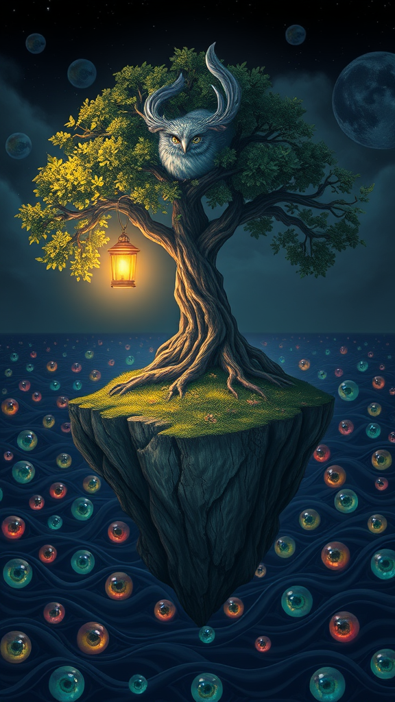 A highly detailed, ultra-realistic illustration of an enigmatic island floating in an ocean filled with multicolored eyes. Atop this island, a majestic tree rises, and perched comfortably on its branches is a mystical creature with a gentle, soft glow surrounding it. The creature, with eyes reflecting the myriad hues of the ocean, holds a beautiful lantern casting a warm, golden light. The scene is enveloped in a dark, serene ambiance with intricate details capturing every leaf and feather. The flawless composition avoids any text, errors, or blurs, ensuring a pristine visual with no hints of low quality or distractions.