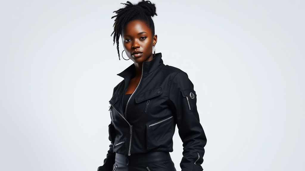 A highly detailed, ultra-realistic image of a Black woman wearing sleek techwear, featuring modern, functional clothing with an urban edge. Her outfit consists of a stylish black jacket with multiple zippers and pockets, complemented by matching pants with a streamlined design. Under studio lighting, her skin has a radiant glow, highlighting her confident expression. Her hair is styled in contemporary fashion, adding to the overall futuristic feel. The setting is minimalistic, emphasizing her as the focal point without distraction. The scene maintains a perfect balance between cutting-edge technology and urban fashion, showcasing her as a trendsetter in the world of techwear.