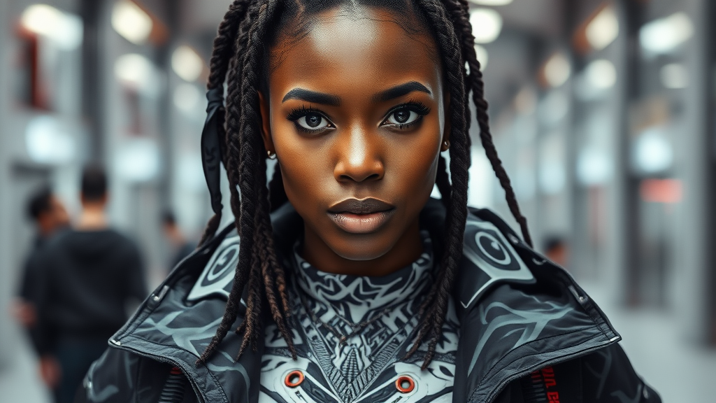 A highly detailed ultra-realistic portrait of a black woman exuding confidence in cutting-edge techwear. Her outfit blends sleek, futuristic fabrics with intricate patterns, showcasing both form and function. Studio lighting highlights her features, casting dynamic shadows and accentuating the textures of her attire. Her expression is poised and focused, with an underlying intensity. The urban and innovative surroundings complement her modern appearance, adding an edge of sophistication and innovation. Subtle modifications in her hairstyle introduce a unique flair, with intricate braids weaving seamlessly into the techwear theme.
