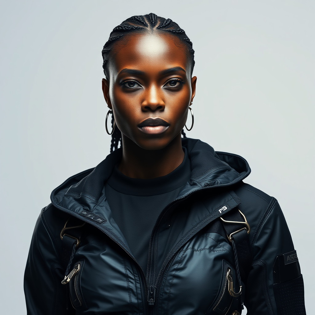 A highly detailed, ultra-realistic portrait of a confident black woman in sleek techwear, captured in studio lighting. Her attire is a blend of modern urban design and futuristic elements, with intricate patterns and textures in dark hues. Her expression is focused and poised, embodying strength and intelligence. The background is minimalist, enhancing her commanding presence. The image is devoid of flaws, highlighting her immaculate style and the precision of her techwear outfit.