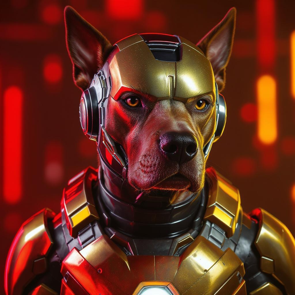 A highly detailed, ultra-realistic portrait of a dog in an alert pose, showcasing a cyberpunk style with a bionic helmet. The dog is clad in an Iron Man-inspired armor, featuring golden hues with chrome plating. The background is illuminated with bright red and yellow contrast lighting. The setting is rendered in octane to emphasize the photorealism, capturing the essence of the dog's alertness. The image is meant to be strikingly detailed yet avoids overly complex or absurd anatomical errors, maintaining coherence in the dog's form, with a focus on its unique mix of organic and mechanical elements.