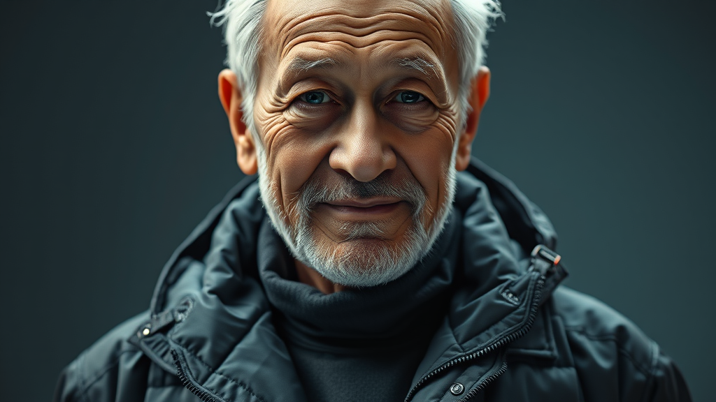 A highly detailed, ultra-realistic portrait of a grandfather dressed in cutting-edge techwear, illuminated by studio lighting. His attire is a blend of sleek, futuristic fabrics and urban style, exuding a sense of modern sophistication. The texture and style of the clothing is prominently featured, showcasing intricate details and advanced materials. Despite the high-tech fashion, the warmth and wisdom in his expression reveal a lifetime of stories. His expressive eyes and gentle smile add a touch of humanity, contrasting with the contemporary outfit. The overall image captures a harmonious balance between tradition and innovation, creating an intriguing narrative without the use of any negative imagery elements.