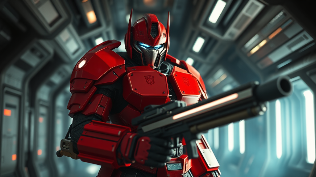 A highly detailed ultra-wide photo captures a formidable warrior clad in red sci-fi armor, featuring a sleek cyber helmet adorned with illuminated elements on the mask. The full insulated armor hints at both strength and advanced technology, reminiscent of Optimus Prime's iconic design. The warrior stands poised in an assertive, dynamic stance, wielding a formidable weapon with an air of readiness. His bald head adds to the fierce aura. The scene is set within the dark corridors of a spaceship, captured in a rich, cinematic style that evokes the atmosphere of a sci-fi thriller. Natural light filters through, accentuating the photorealism and intricate detailing of the armor. Enhanced by ray tracing and moody lighting, the imagery achieves an Ultra-HD, 8K resolution fidelity. The composition is presented in a third-person view, incorporating a blur effect and long exposure to amplify the depth and motion, resulting in dramatic cinematic lighting.