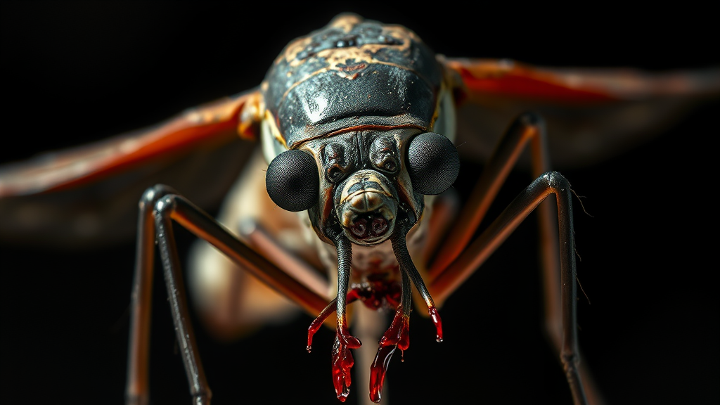 A highly detailed, unsettling mosquito with glossy, blood-soaked skin glistens under natural light, its appearance disturbingly realistic. Set against a shadowy, eerie background, the creature's hauntingly black, lifeless eyes stare blankly. Its skin, marred by grotesque scars, adds to the horror as large, menacing fangs protrude menacingly. Blood drips persistently from its body, enhancing the sinister, horror-laden atmosphere in this striking close-up.