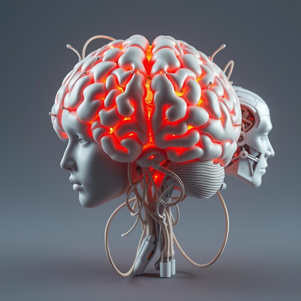 A highly intricate 3D render of a stunning porcelain human brain with cyborg and robotic elements, intricately detailed at 150mm scale, enveloped in exquisite studio soft lighting. The piece features rim lighting that highlights vibrant details. It embodies luxurious cyberpunk aesthetics interwoven with lace-like structures and hyperrealistic textures. Electric cables and delicate microchips are seamlessly integrated, showcasing elegance against a captivating backdrop. Rendered in Octane with 8k resolution, the design is inspired by H.R. Giger, featuring deformed, asymmetric beauty with additional arms and legs. The creative composition extends to two heads, intertwined with a group of abstract human forms, each echoing the fusion of organic and mechanical in an otherworldly assembly.