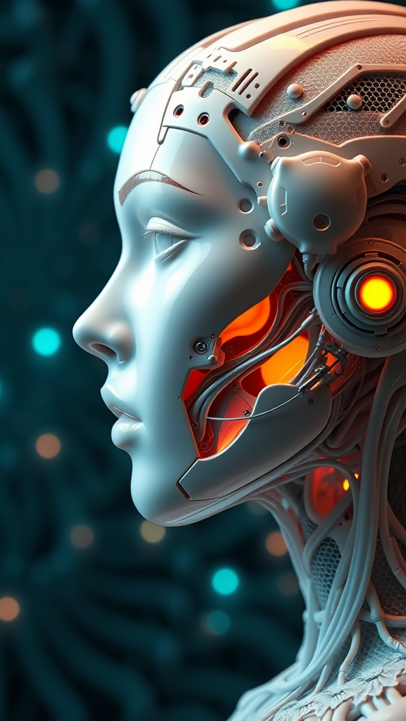 A highly intricate 3D render of an exquisite porcelain profile of a female android face, featuring cyborg elements with robotic components; the piece measures 150 mm and is illuminated by elegant studio soft lighting and a subtle rim light. Showcasing vibrant and luxurious cyberpunk details, including delicate lace textures and hyperrealistic anatomical features such as visible facial muscles interwoven with cable electric wires and microchip patterns. The scene exudes elegance against a stunning, beautiful background, inspired by the surreal aesthetics of H. R. Giger. This composition is rendered in ultra-high definition 8k using Octane render, enriched with creative modifications that subtly enhance the core theme.