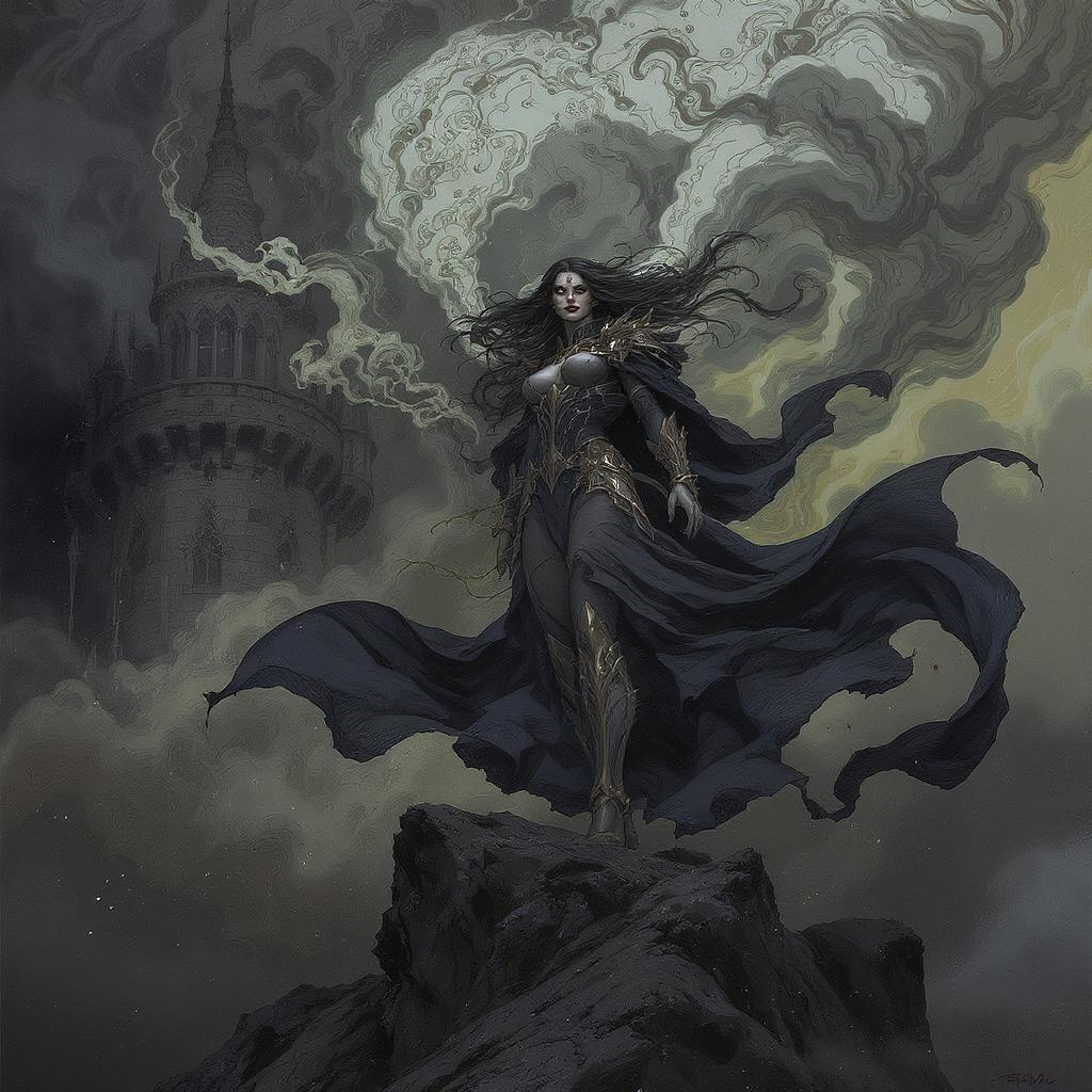 A highly intricate and hyper-maximalist depiction imbued with cinematic royalty, featuring a figure shrouded in darkness with long, wind-tousled hair and flowing garments. Inspired by the essence of Magic the Gathering, the scene is awash in vibrant contrasts with swirling clouds of toxic fumes and mysterious smoke forming spiraling specters. Set against the foreboding backdrop of a massive, shadowed castle, the vision is crafted with a style reminiscent of Massimo Caggese's ominous intricacies, infused with the richness of octane and the surreal elegance of Moebius. The figure strikes a gorgeous, commanding pose as if lifted from the best of ArtStation and brought to life through the power of Unreal Engine. The composition is bathed in dramatic lighting and sharp, expressive shadows, woven with orthodox symbolism that hints at deeper meanings. This concept art piece embodies magic realism and is enriched with ambient occlusion, enhanced by volumetric lighting to evoke profound emotions. Designed in tribal dark fantasy aesthetics, it is rendered in breathtaking 8k resolution, a tapestry of complexity and ethereal beauty.