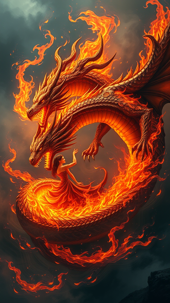 A highly intricate hyper-maximalist depiction of a majestic and regal colossal fire dragon entwined with his enchanting queen of flames, both immersed in a spiraling inferno against a backdrop of swirling dark mist. The scene exudes an ominous yet captivating atmosphere, capturing the essence of Magic the Gathering, with a meticulous design that highlights an exquisite pose illuminated by dramatic lighting and shadows. The composition draws inspiration from orthodox symbolism, blending elements of tribal dark fantasy with a touch of magic realism. The artwork is rendered in stunning 8k resolution, reflecting the depth and breadth of concept art found on ArtStation, offering a mesmerizing visual narrative in an expansive 3:2 aspect ratio.