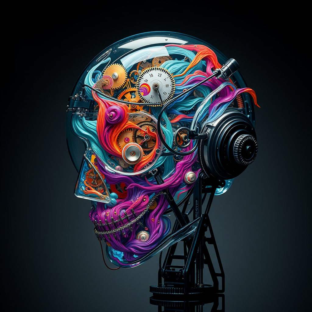 A highly intricate robot head composed of elaborate clockwork mechanisms, featuring a transparent exterior filled with swirling, vibrant liquids that convey a sense of movement and emotion. The design is expressive and abstract, capturing a sense of futuristic sophistication and artistry. Set against a striking backdrop, the creation evokes the signature style of Ryohei Hase, blending imaginative detail with contemporary flair, making it a standout piece trending on ArtStation.