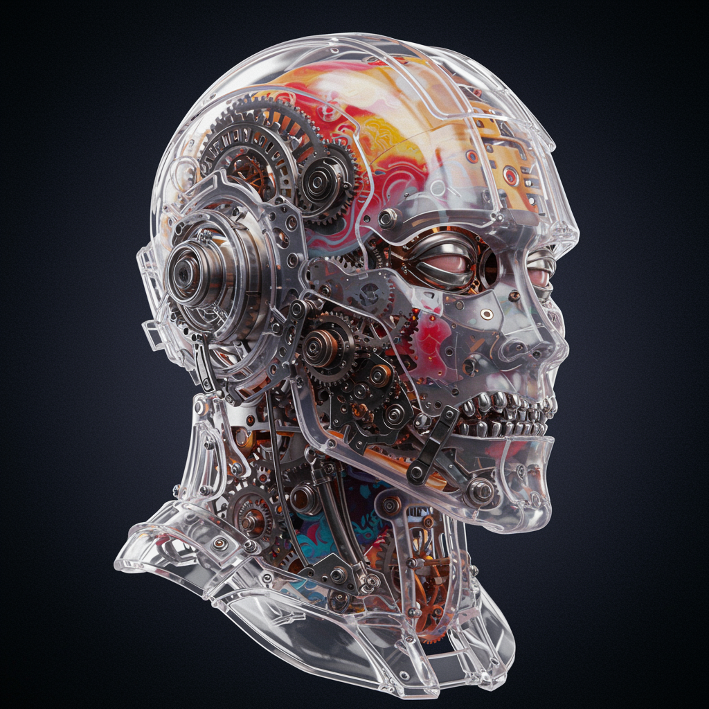A highly intricate robot head showcasing visible clockwork mechanisms, its transparent surface allows glimpses of vibrant, swirling liquid inside. The design is expressive and abstract, capturing a fusion of mechanical precision and artistic fluidity. Influenced by the style of Ryohei Hase, the piece is visually compelling, with an emphasis on trending art concepts, mixing industrial elements with a splash of surreal color and emotion.