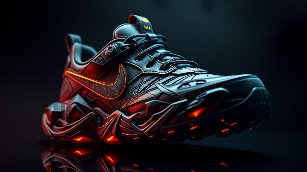 A highly intricate sneaker design inspired by Nike and Batman, featuring sleek, futuristic elements and Gotham City motifs, captured in ultra-high-definition 8k resolution with a dramatic dark and sleek color palette, emphasizing sharp lines and aerodynamic forms, presented in a 4:5 aspect ratio.