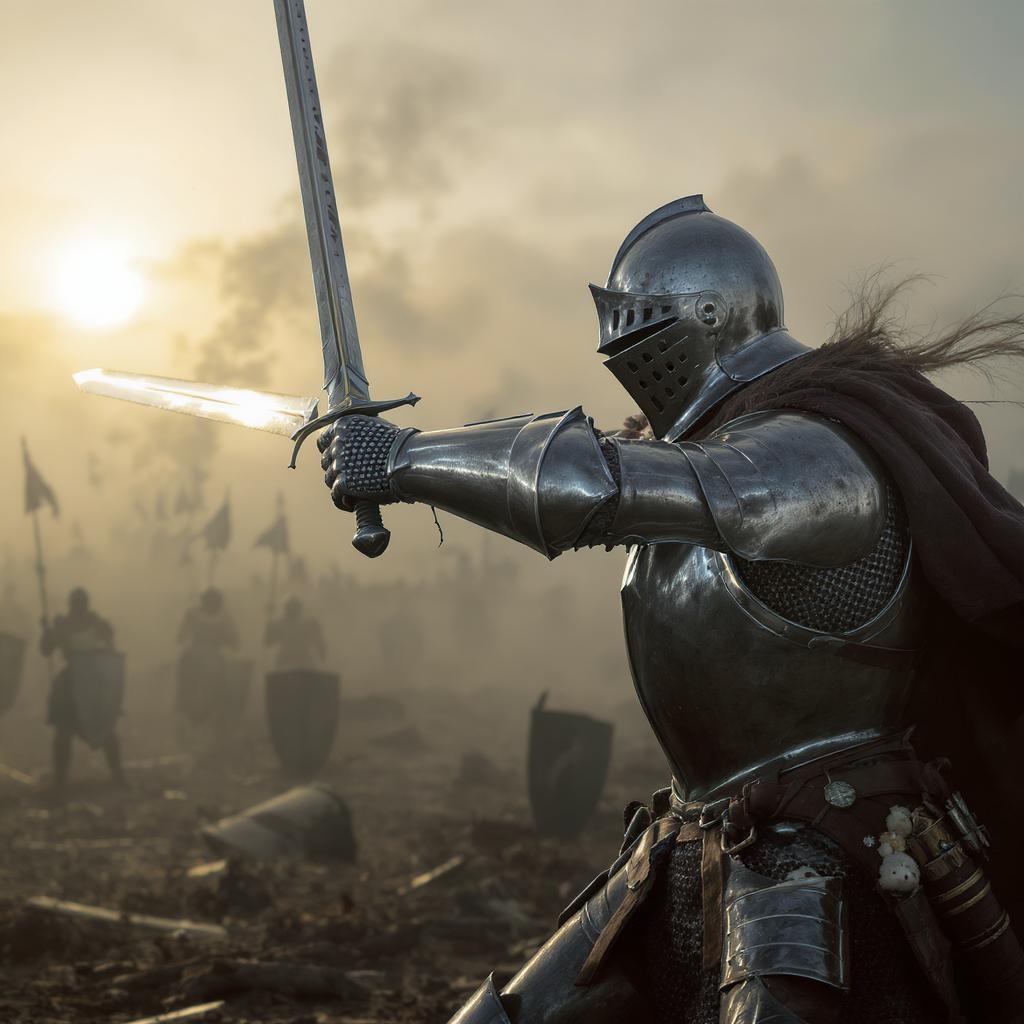 A highly realistic depiction of a medieval knight clad in intricate full body armor, expertly wielding a gleaming long sword. The scene captures the dynamic motion and power of the swing, showcasing the exquisite craftsmanship of the armor with ultra-detailed attention to every rivet and plate. The knight's determined expression is visible through the visor, hinting at a story of valor and strength. Set against a backdrop of a misty battlefield at dawn, the atmosphere is enhanced by the interplay of light and shadow, adding depth and a sense of epic scale to the composition.