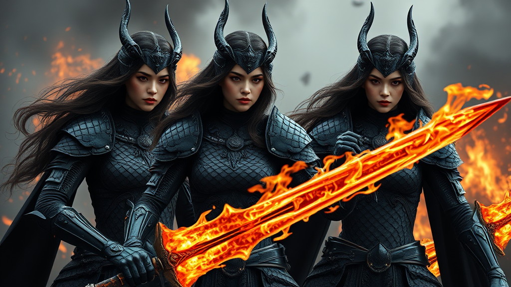 A highly realistic depiction of women clad in ominous jet-black armor crafted with intricate dragon scales, wielding a blazing fire sword. Their human faces exhibit extraordinary detail, with sharp and expressive features framed by long, flowing hair. The dragon-themed armor showcases precise craftsmanship, designed with super detailed accents. Each figure stands in an epic pose against a backdrop of swirling fire and ash, exuding an air of horror and power. The composition captures their full body in razor-sharp focus, highlighting the high-resolution detail akin to a reality graphic, enveloped in a resonant atmosphere that enhances the sense of scale and drama, encapsulated within a 32k resolution.