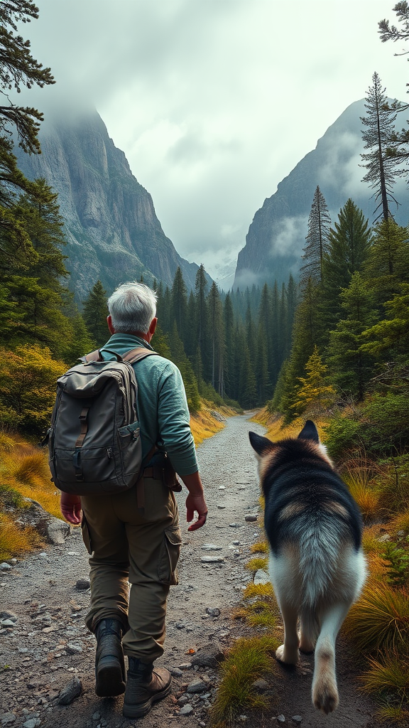 A highly realistic image of a middle-aged man with an average build and short, salt-and-pepper hair, accompanied by a Siberian husky by his side. The man is seen from a slight angle, wearing rugged exploration gear, as he ventures toward a vast and majestic Patagonian forest. The path is natural, rugged, and lined with vibrant greenery, with colossal trees towering in the distance and gentle light filtering through a cloudy sky, casting a serene and adventurous mood. The Husky is alert and focused, with its fur subtly illuminated by soft, natural light. The scene captures the untamed beauty of Patagonia—pristine wilderness, dramatic landscapes, and the spirit of exploration. Intricate textures on clothing, dog fur, and nature, with cinematic composition and realistic color tones, echoing a hyper-detailed masterpiece blending the stylings of Studio Ghibli and the artistry of John William Turner.