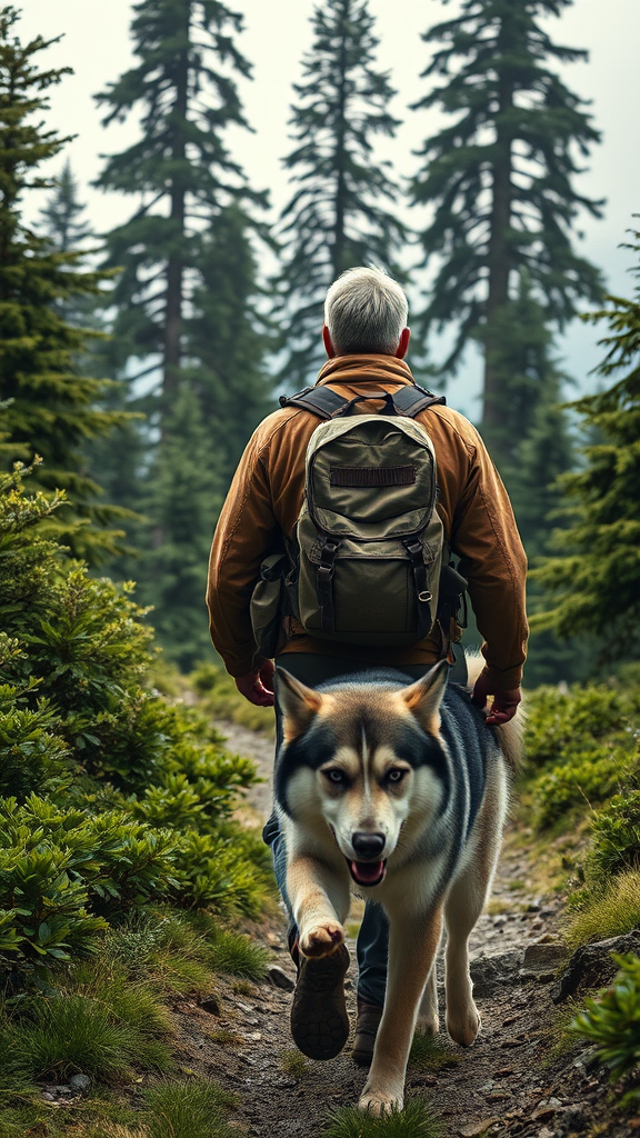 A highly realistic image of a middle-aged man with an average build and short, salt-and-pepper hair, trekking alongside a majestic Alaskan Malamute in place of a Siberian husky, both harmoniously journeying towards an expansive and awe-inspiring Patagonian wilderness. Viewing the man from behind, he is clad in rugged exploration attire, stepping along a naturally rugged path enveloped by luxuriant greenery. Towering ancient trees loom in the distance, with soft, diffused light permeating through an overcast sky, casting a serene yet adventurous ambiance. The Malamute, with its fur subtly kissed by gentle natural light, remains vigilant and engaged. This scene encapsulates the untouched grandeur of Patagonia—a land of unspoiled wilderness and dramatic landscapes, beckoning the spirit of adventure. The image boasts hyper-detailed textures in clothing, the dog's fur, and the surrounding nature, all wrapped up in a cinematic composition with realistic and vivid color tones, creating an artistic masterpiece that channels the essence of exploration.
