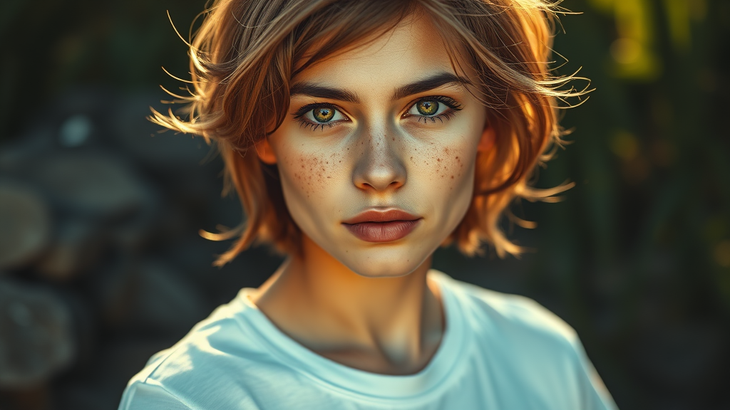 A highly realistic portrait of a woman with subtle freckles and expressive round eyes, her short, tousled hair playfully framing her face as she stands outdoors. Her gaze meets the camera with intensity, wearing a simple white t-shirt that complements the natural setting. Her slightly chapped lips give a raw, authentic appeal. The soft, natural light creates a halo effect around her, enhancing the scene's magical quality. The intimate portrait composition reveals dramatic lighting nuances, capturing every minute detail as if taken with a high-precision Leica 50mm lens at f1.4 aperture, producing an ultra-detailed, photo-realistic image full of emotion and depth.