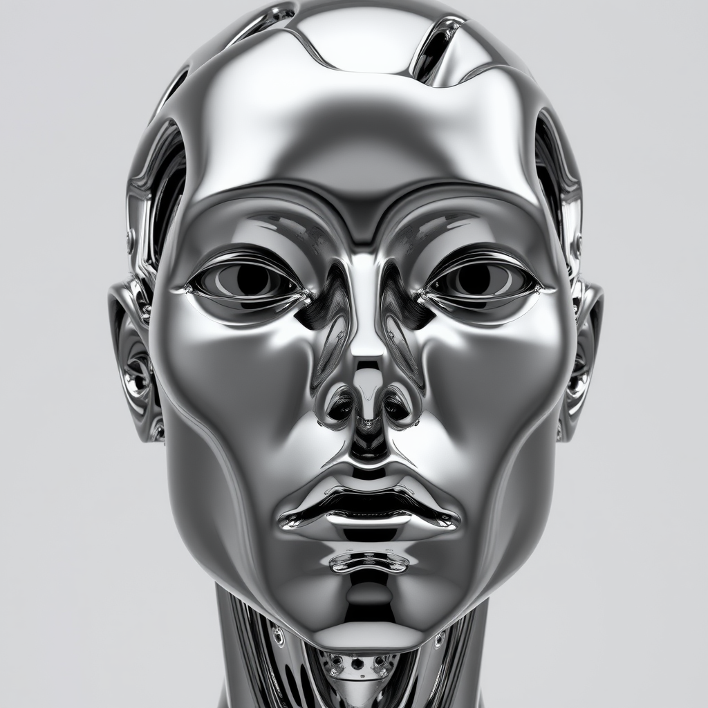 A highly reflective, sleek metal humanoid face intricately warped into abstract forms, exhibiting a chilling chrome-like texture that seamlessly merges organic and mechanical elements, presented in a monochromatic palette with hyper-realistic ultra high definition, showcasing rich and intricate detail --ar 9:16.