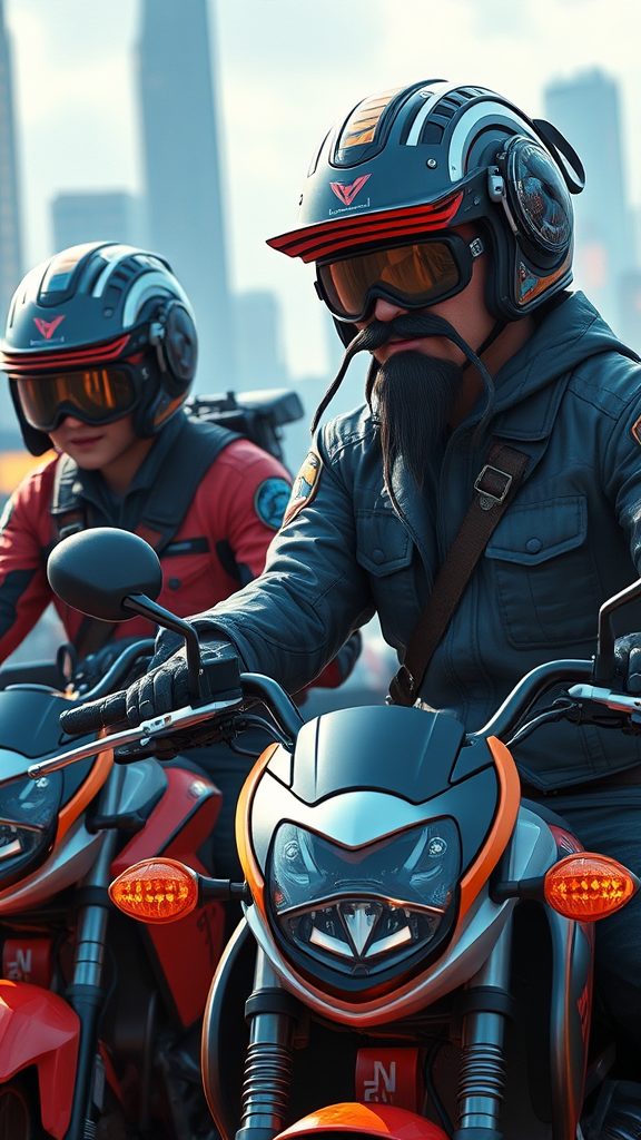 A highly-skilled game developer has engineered a groundbreaking VR MMORPG, where the universe is powered by artificial intelligence that evolves organically, mirroring real-life at an accelerated rate. This immersive experience captivates players, particularly due to the presence of astoundingly realistic NPCs. Over time, these NPCs begin to develop their own consciousness, turning the game into a living universe. The game features elements such as motorbikes, enigmatic characters with dual personalities or appearances, and futuristic cities. Within this realm, there are bikers with intricate helmets, characters with unique facial features like elongated beards, and others sporting pointed footwear. Despite the vivid living experience, some elements are intentionally abstract, with blurred lines and dreamlike elements adding to the sense of wonder. The game's graphics are polished, avoiding errors in anatomy and proportion, ensuring each character and their environment feels naturally integrated into this thriving digital universe.