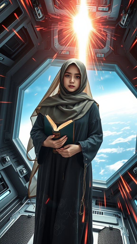 A hijabi girl with adorable features, adorned in Islamic attire and sporting cyberpunk-inspired prosthetics, stands inside a futuristic spaceship. Her long hair flows as she holds a Quran delicately. The setting is a high-tech sci-fi realm, characterized by hyper-detailed photorealism. A brilliant laser beam cuts through the center, extending from the sky to the ground, creating dynamic energy clots. The scene is filled with a sense of motion and speed, highlighted by flashes of light and rapid acceleration. The image is a cinematic marvel, captured in stunning 8K HD super resolution, with artistic long exposure effects illustrating the intensity and fast-paced environment.
