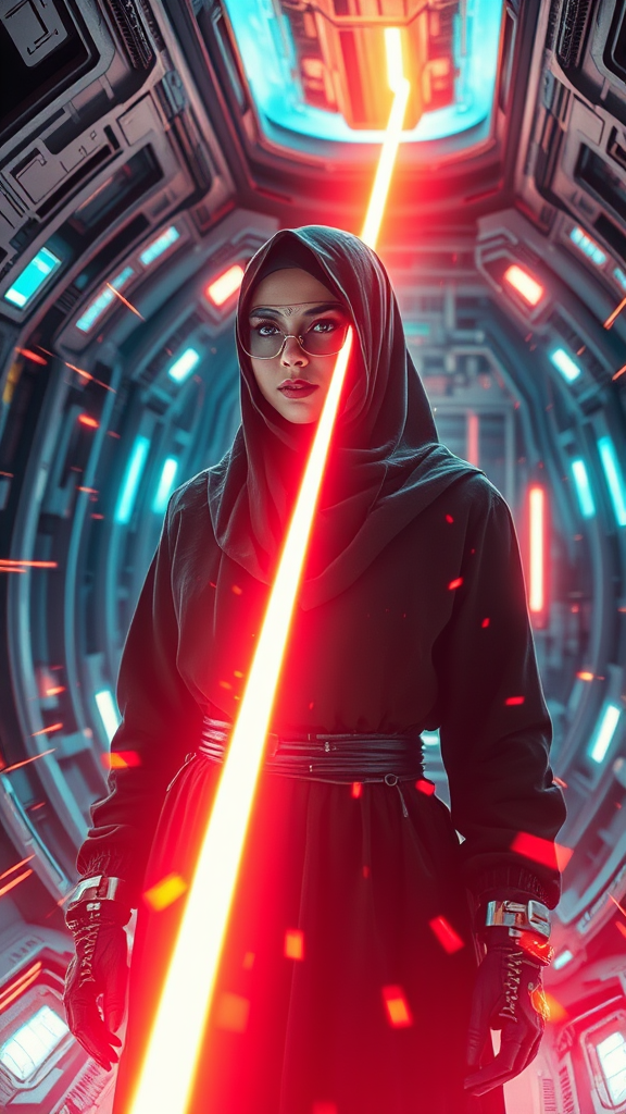 A Hijabi Muslim girl with cyberpunk prosthetics, wearing a modern fusion of traditional Islamic dress, her long hair subtly visible, standing inside a futuristic spaceship with intricate details. The scene is sci-fi and hyper-detailed, with a vibrant laser beam in the center, connecting to an energy source from the sky. Energy clots pulse around her, creating a photorealistic and hyper-realistic atmosphere. The environment is dynamic, capturing a sense of acceleration and speed with vivid light flashes. This scene is like a cinematic painting in 8K super-resolution, utilizing long exposure techniques to emphasize the fluidity and motion of the lasers and energy fields, offering a breathtaking visual narrative in this high-definition, futuristic setting.