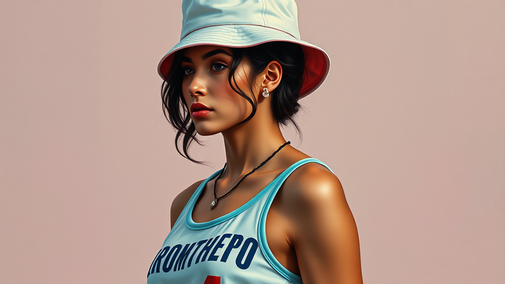 A hip Colombian supermodel, styled in the distinctive Egon Schiele artstyle, stands confidently in profile view. She wears a chic tank top jersey emblazoned with "PROMPTHERO" across it. Her look is completed with an adorable pastel bucket hat perched atop her head, adding a playful touch. The scene is captured in a vibrant color palette, infusing a modern twist on the classic Schiele style. The background is a subtle, abstract blend of hues to highlight the model’s striking presence, with a detailed focus on the textures of fabric and skin to reflect the expressive nature of Schiele’s work.