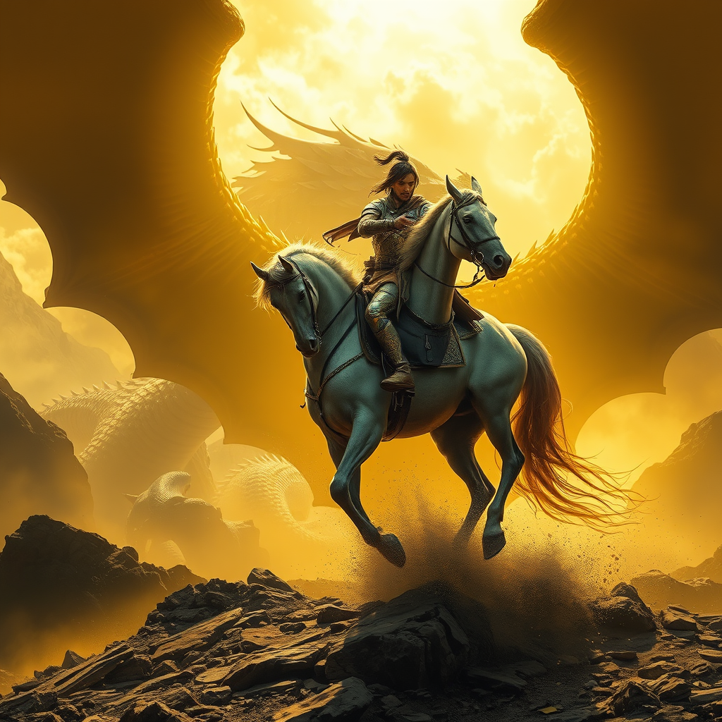 A horse rider gracefully navigates through a dramatic landscape, blending the grandeur of cinematic montages with the mythical essence of dragon art, reminiscent of Franciszek Starowieyski. The scene is bathed in hues of yellow and white, capturing the ethereal light of an ancient world. Hyper-realistic details bring each element to life, from the intricate armor of the rider to the majestic scales of dragons in the background. Echoes of John Howe's artistry and the spiritual motifs of Himalayan art add depth and mystique, crafting a visually stunning tableau that blurs the line between reality and myth.