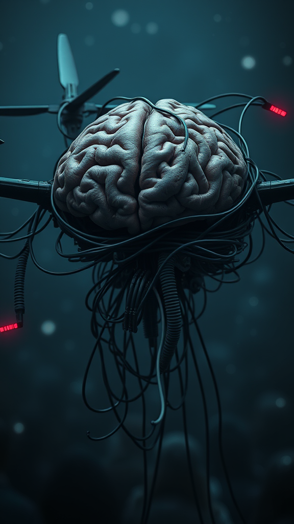 A human brain intricately crafted into a mechanical and organic drone form, entwined with a network of wires and electronic cables, evokes scenes reminiscent of a dystopian film. Styled in dark, muted deep blues and greys characteristic of frostpunk, captured through the lens of a Samyang AF 14mm f/2.8 RF. The compositions are detailed and layered, mirroring the capability of a Nikon D850 to capture the narrative diptychs. In the midst of detailed crowd scenes, the essence is akin to a Kodak Ektachrome photograph, with a dramatic interplay of lighting casting moody color schemes. The atmosphere is shrouded in gloom and fog, adding to the eerie, captivating ambiance.