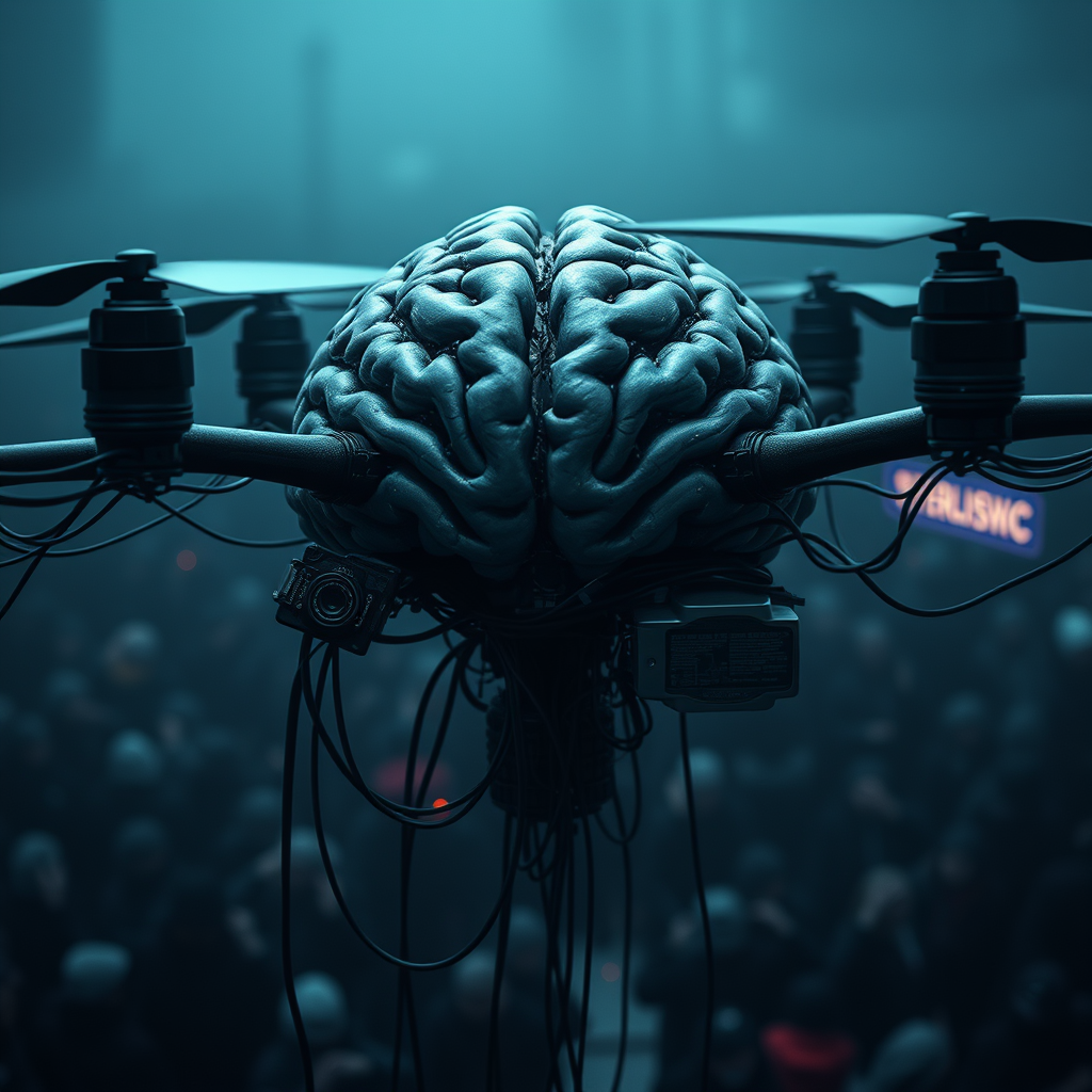 A human brain-like organ intricately recreated using mechanical and organic elements, forming the structure of a drone with an array of connected wires leading to electronic cables; scenes conjuring moments from a dystopian film. The palette reflects dark muted shades of deep blue and grey, echoing frostpunk aesthetics. Captured through a samyang af 14mm f/2.8 rf lens with detailed, layered compositions akin to using a Nikon D850. The imagery unfolds in narrative diptychs, revealing detailed crowd scenes with the aesthetic nuances of a Kodak Ektachrome photograph. Lighting is used dramatically to craft moody, atmospheric color schemes in a setting imbued with a gloomy, foggy essence.