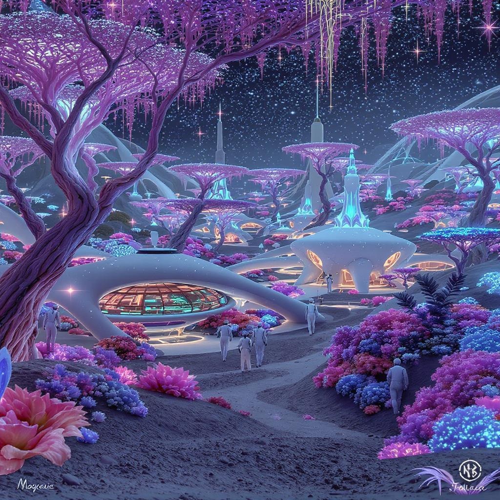 A human colony established on an uncharted planet, featuring sleek, clean white structures nestled among bright, vividly colored vegetation. The landscape is under a canopy of bioluminescent plants that illuminate the surroundings. This hyperrealistic scene is crafted with lush detail, showcasing intricate filigree and crystalline features, enhanced by global illumination. Cosmonauts explore this alien world, where an ethereal, dream-like ambiance akin to an LSD experience permeates the environment. The scene is adorned with lens flares and nuances of visual anomalies such as text distortions, merged and missing fingers, or extra digits. Elements of the composition might appear cropped, with occasional jpeg artifacts or unrefined anatomy, such as unnecessary limbs or flawed hands and feet. This world might present out-of-frame visuals, tiling errors, and art imperfections, displaying a disfigured or mutated appearance, with some parts blurry or fuzzy. Watermarks and signatures might be subtly present, adding an unintentionally chaotic artistry to the colony's extraordinary aesthetics.