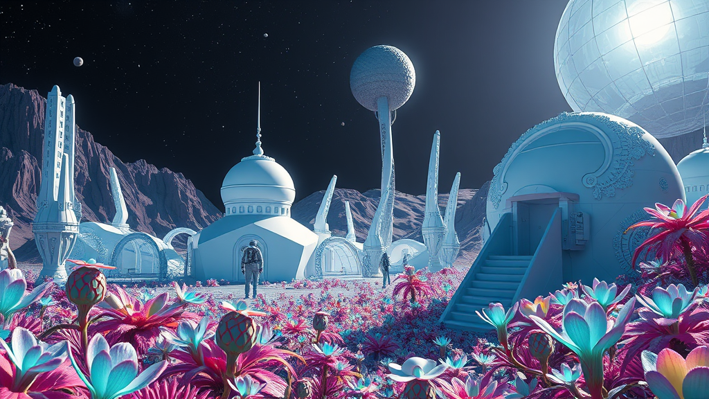 A human colony on an uncharted planet features sleek, clean white structures amidst vibrant, kaleidoscopic flora. The landscape is alive with bioluminescent plant life, casting an ethereal glow against the hyperrealistic backdrop. Detailed, intricate designs create a sense of lush filigree and crystalline aesthetics, enhanced by global illumination that captures every nuance. Cosmonauts explore this mesmerizing world, surrounded by lens flare, shadowy textures, and abstract forms that hint at an otherworldly presence. Mysterious artifacts hint at both beauty and distortion in this surreal environment, drawing attention to the blend of exquisite detail and occasional imperfections.